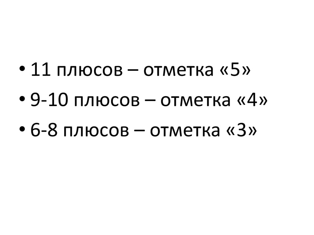 • 11 плюсов – отметка «5»• 9-10 плюсов – отметка «4»