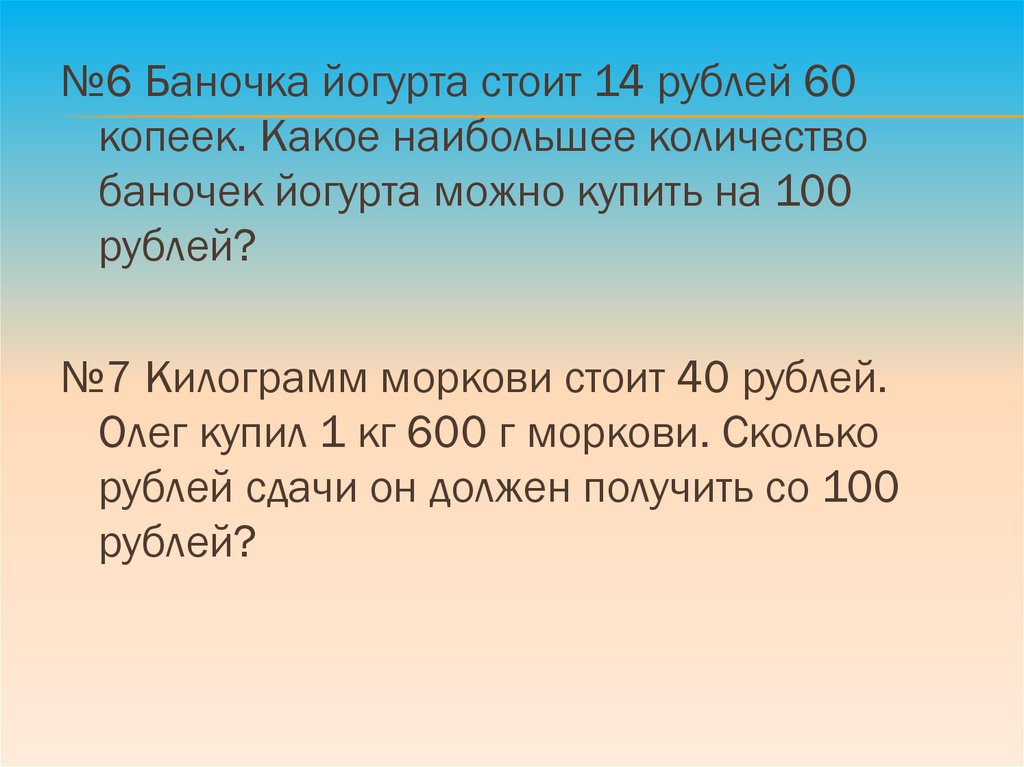 №6 Баночка йогурта стоит 14 рублей 60копеек. Какое наибольшее количество
