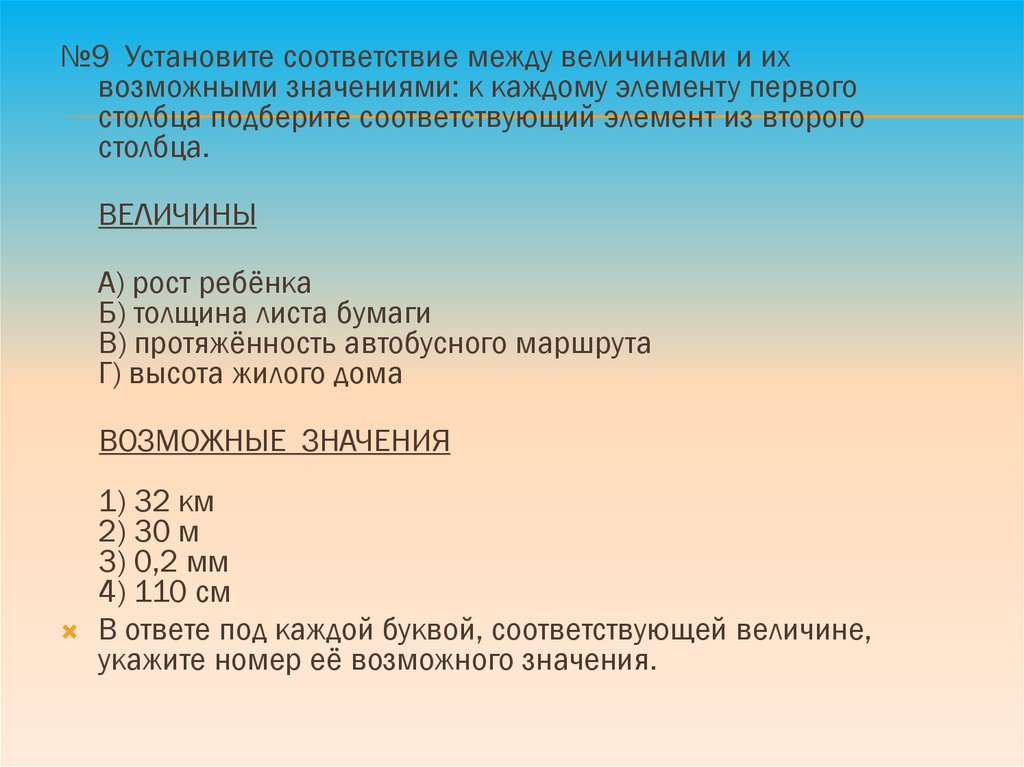 №9 Установите соответствие между величинами и ихвозможными значениями: к каждому элементу первого