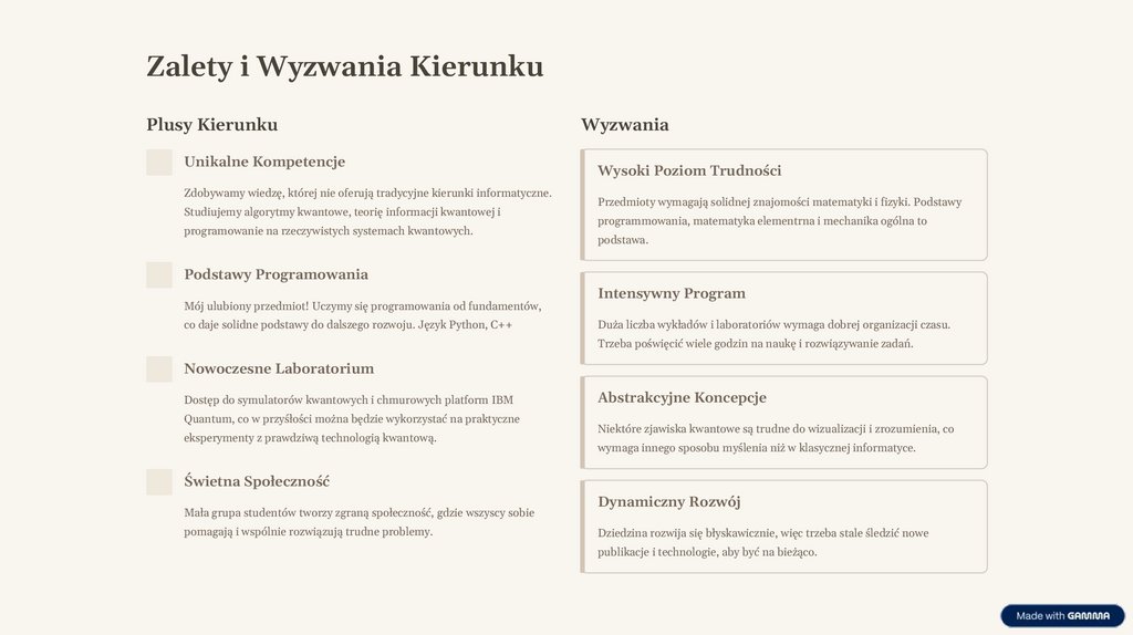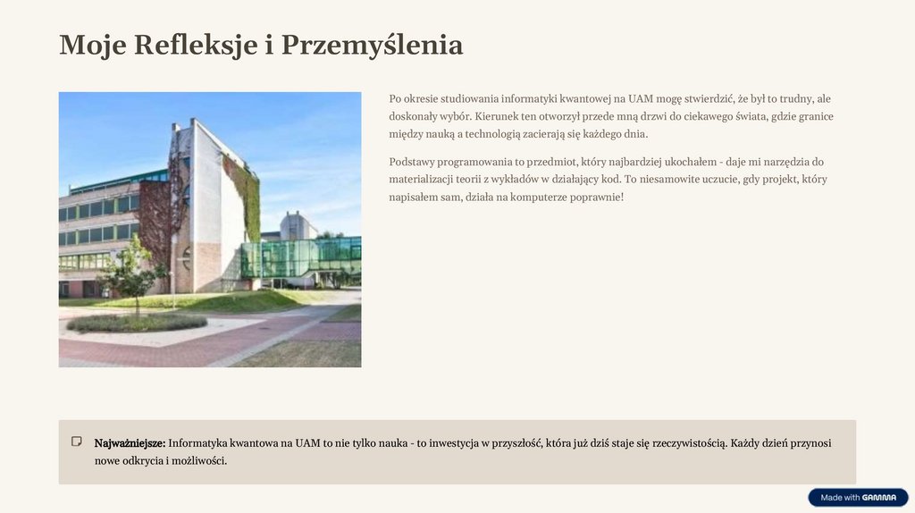 Moje Refleksje i PrzemyśleniaPo okresie studiowania informatyki kwantowej na UAM mogę stwierdzić, że był to trudny, ale