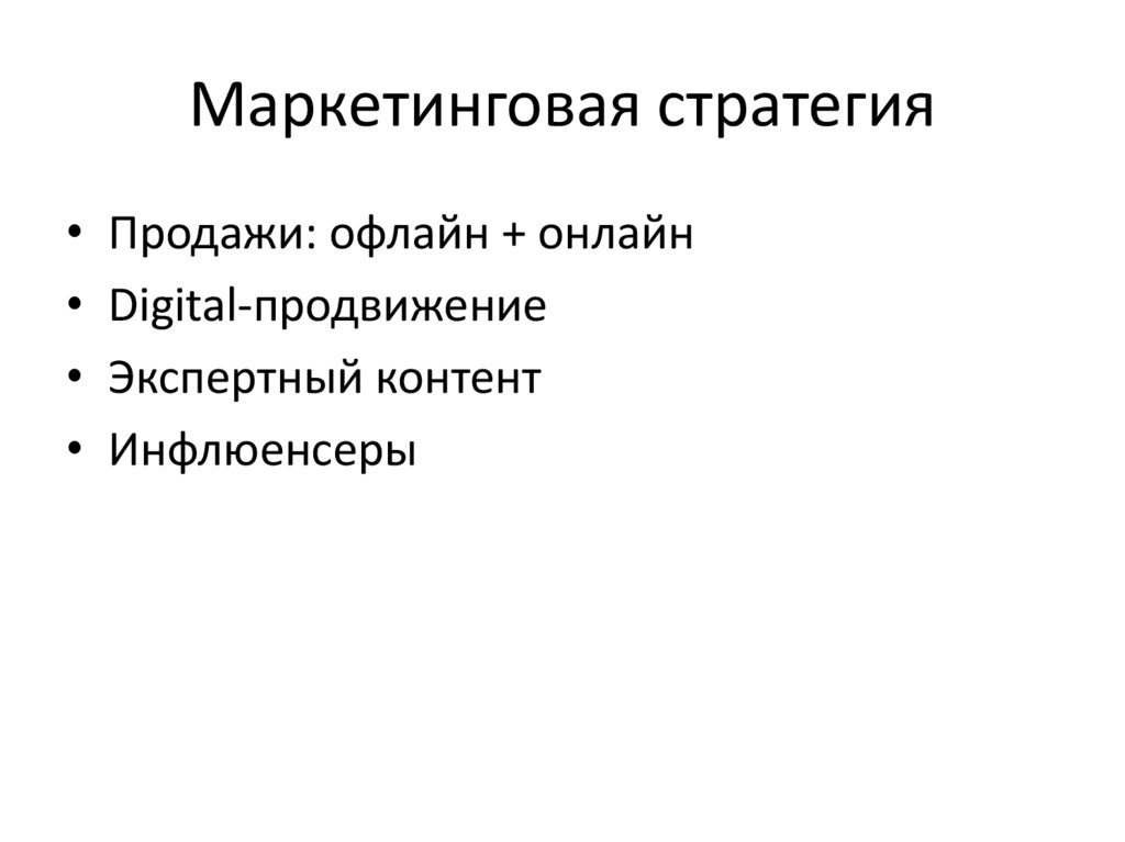 Маркетинговая стратегия• Продажи: офлайн + онлайн