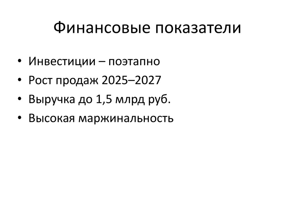 Финансовые показатели• Инвестиции – поэтапно