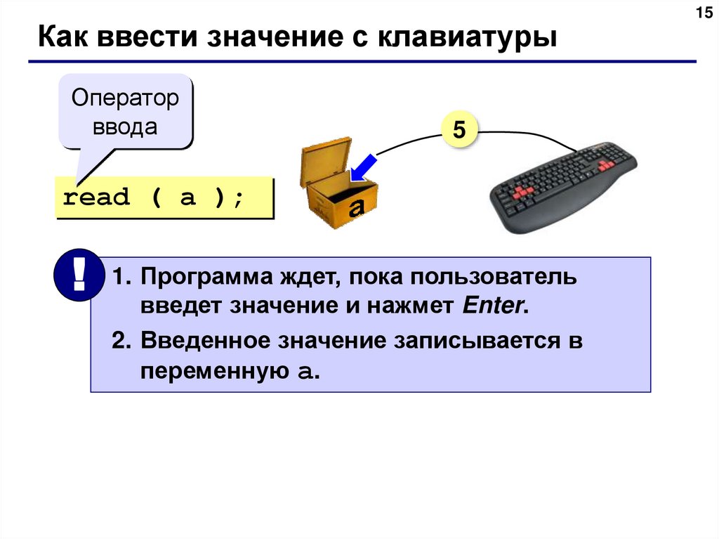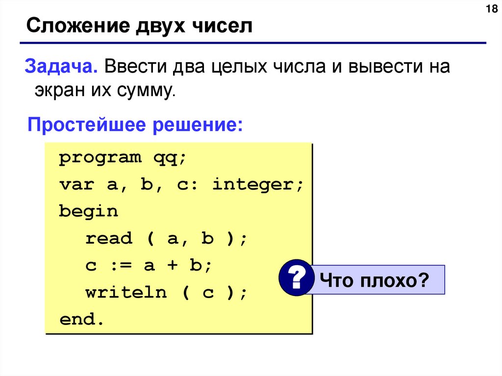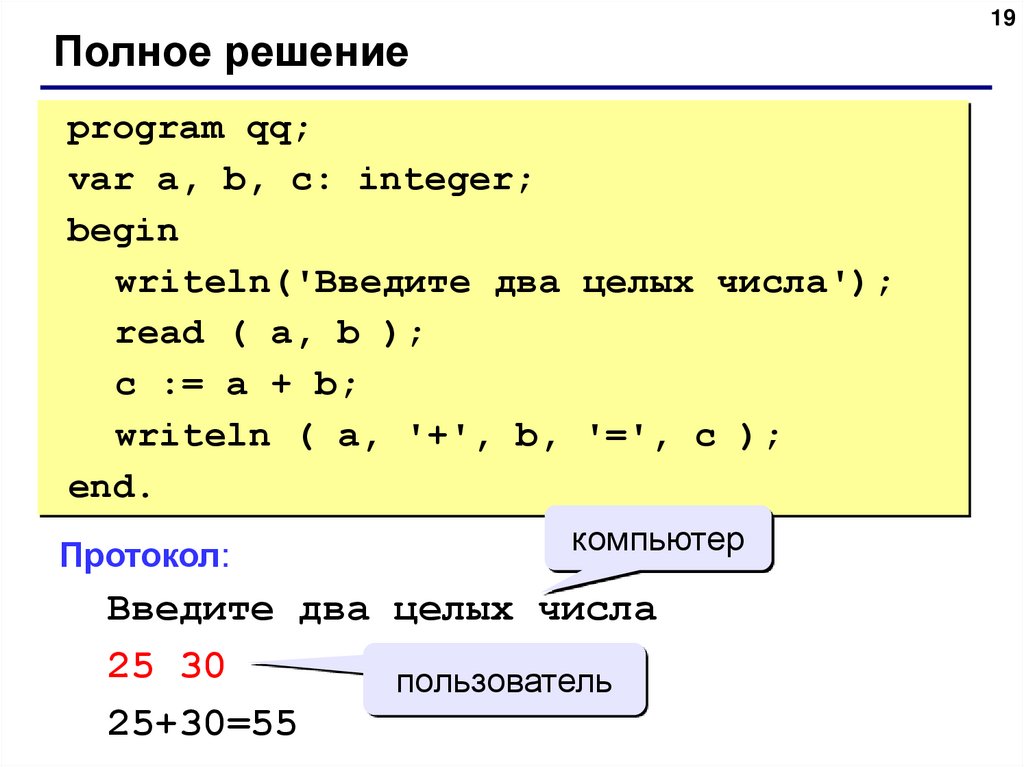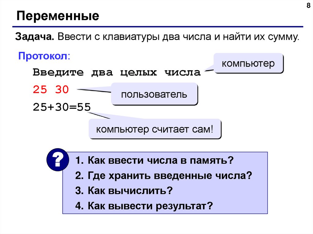 Задача. Ввести с клавиатуры два числа и найти их сумму.