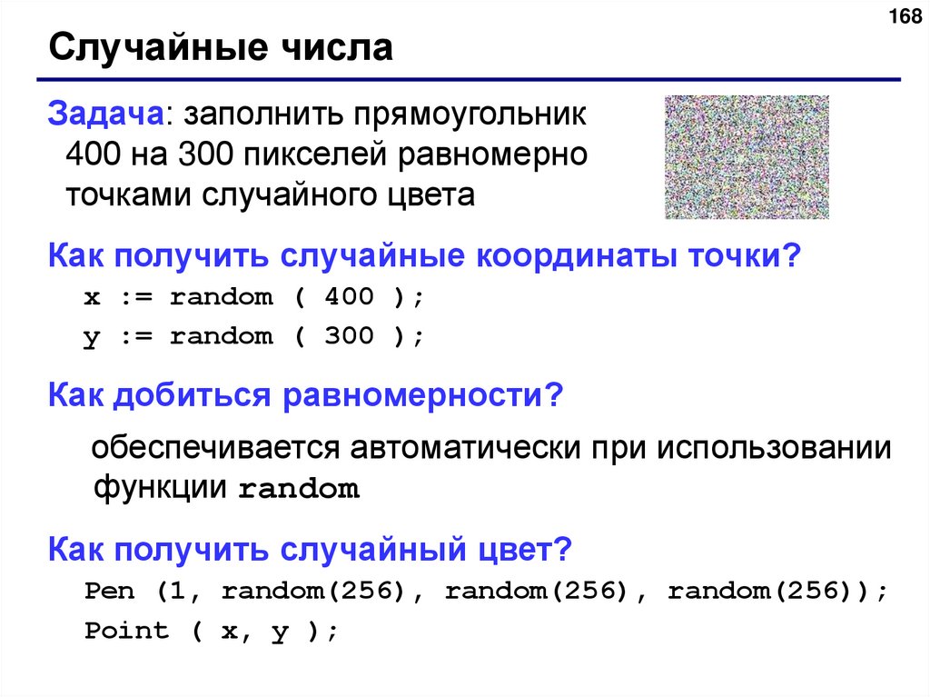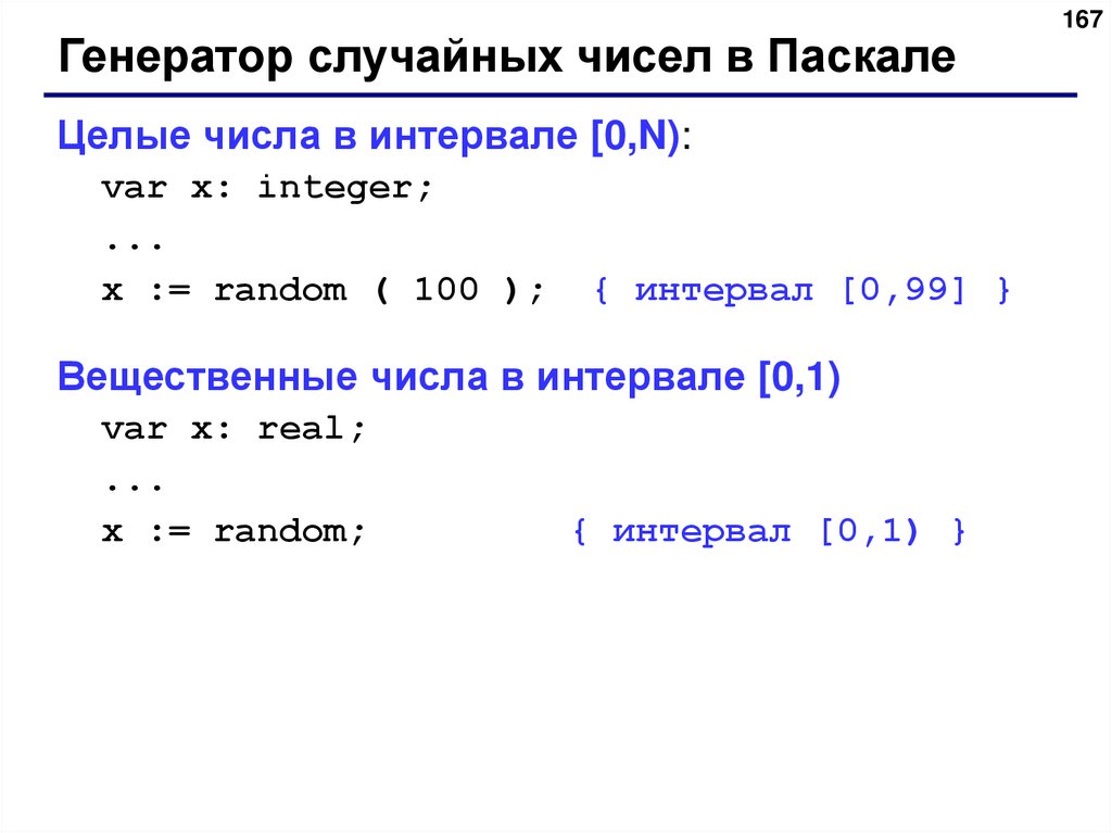 Генератор случайных чисел в ПаскалеЦелые числа в интервале [0,N):
