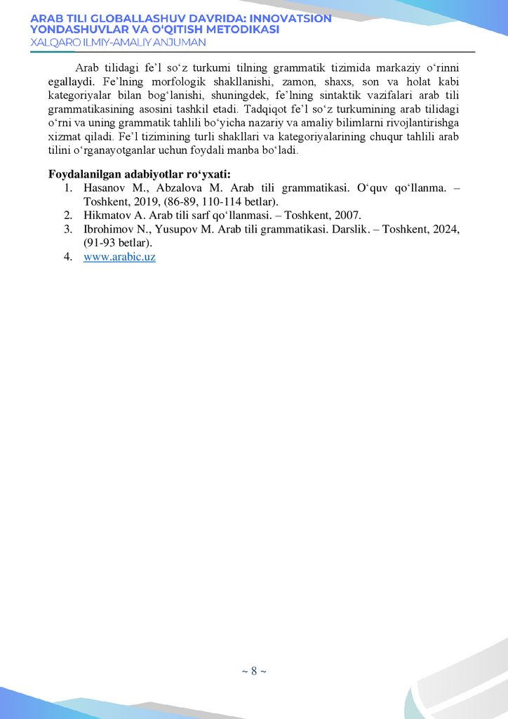 3. Ibrohimov N., Yusupov M. Arab tili grammatikasi. Darslik. – Toshkent, 2024,