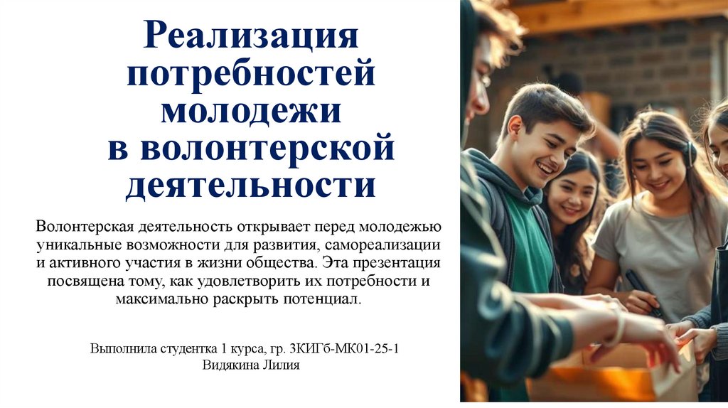 • Волонтёрская деятельность — важный инструмент дляреализации потребностей молодёжи, позволяя им не только