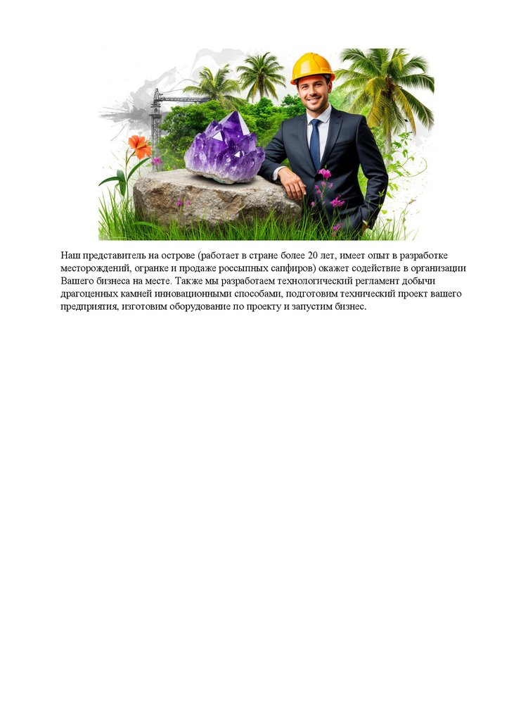 Наш представитель на острове (работает в стране более 20 лет, имеет опыт в разработкеместорождений, огранке и продаже россыпных сапфиров) окажет содействие в организации