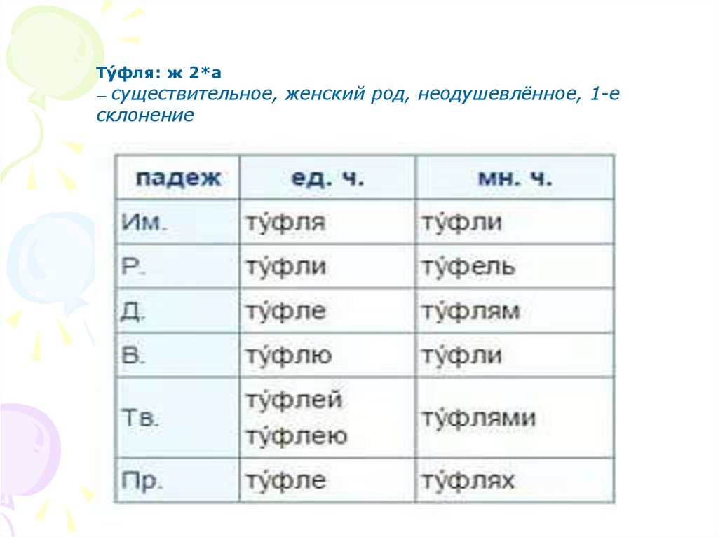 Ту́фля: ж 2*aсуществительное, женский род, неодушевлённое, 1-е