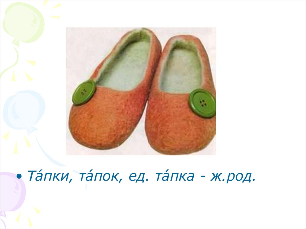 • Та́пки, та́пок, ед. та́пка - ж.род.48. Названия обуви и парных предметов