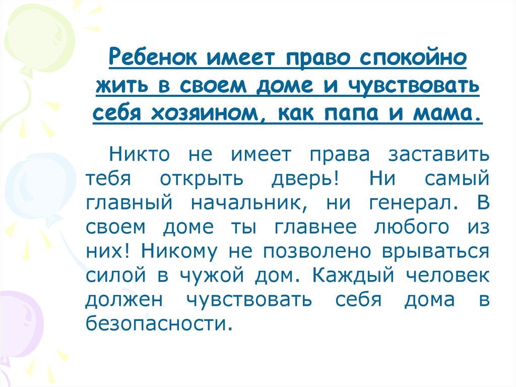 Ребенок имеет право спокойножить в своем доме и чувствовать
