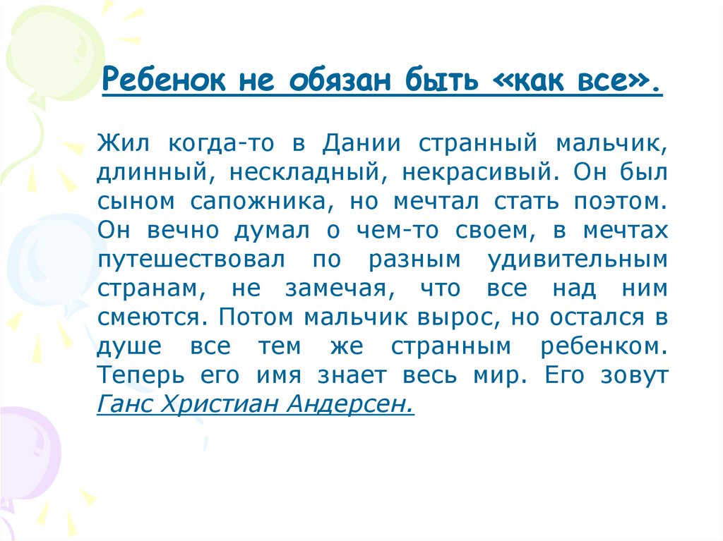 Ребенок не обязан быть «как все».Жил когда-то в Дании странный мальчик,