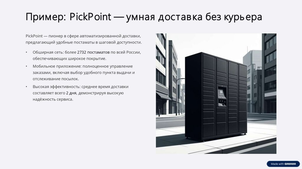 Пример: PickPoint — умная достав ка без курь ераPickPoint — пионер в сфере автоматизированной доставки,