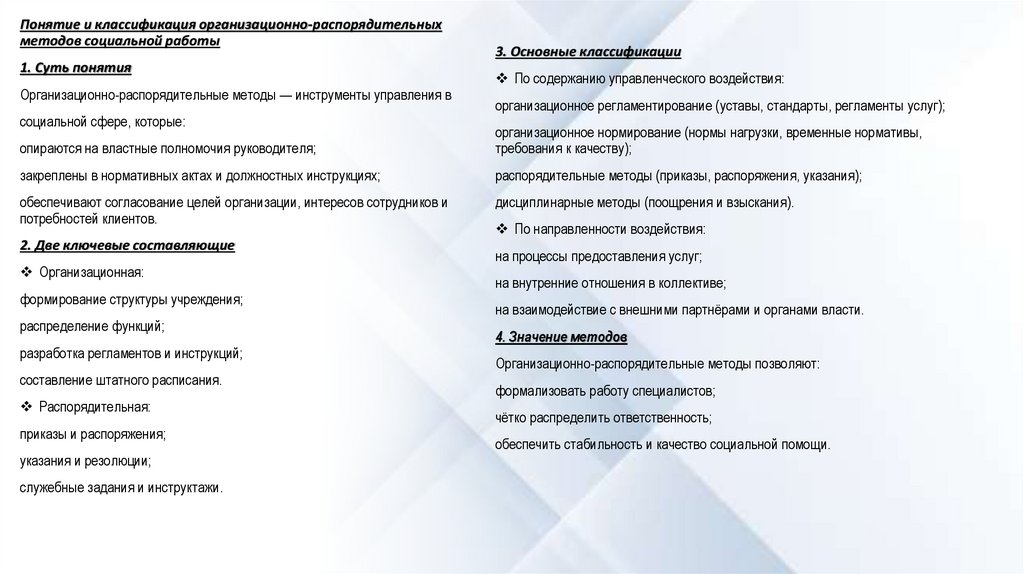 Понятие и классификация организационно-распорядительныхметодов социальной работы