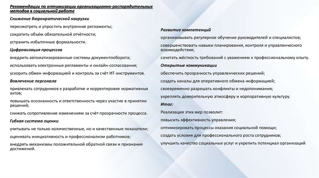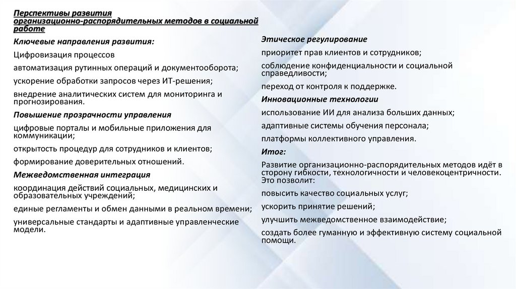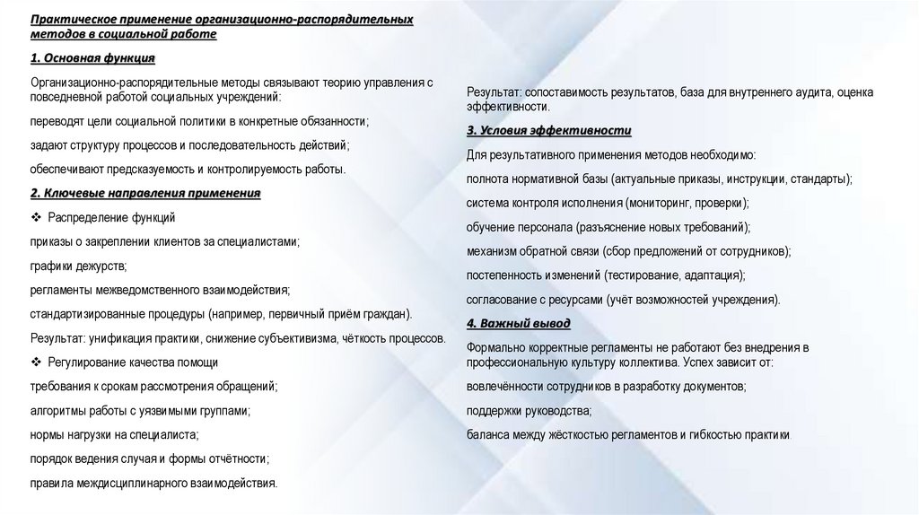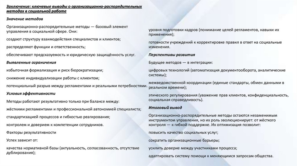 Заключение: ключевые выводы о организационно-распорядительныхметодах в социальной работе