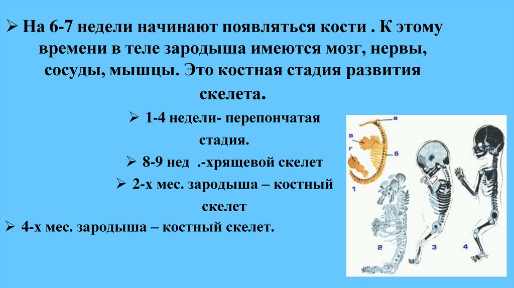 На 6-7 недели начинают появляться кости . К этомувремени в теле зародыша имеются мозг, нервы,