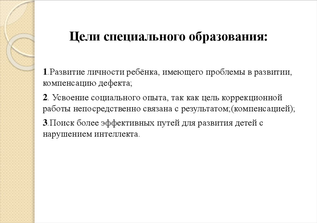 Цели специального образования:1.Развитие личности ребёнка, имеющего проблемы в развитии,