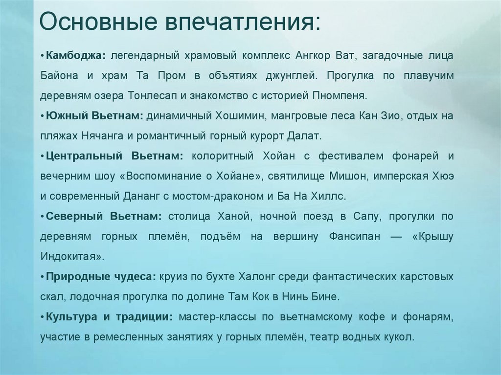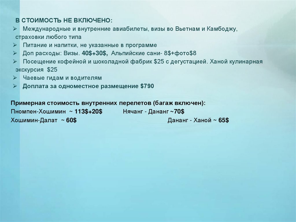В СТОИМОСТЬ НЕ ВКЛЮЧЕНО:⮚ Международные и внутренние авиабилеты, визы во Вьетнам и Камбоджу,