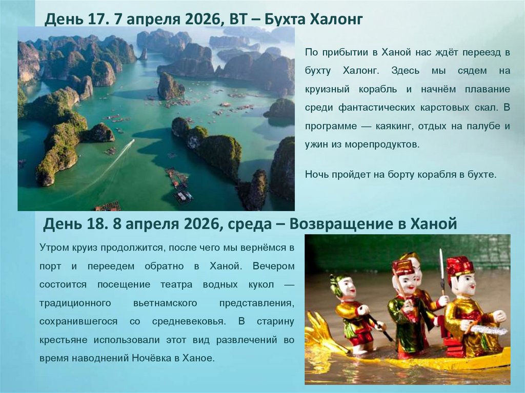 День 17. 7 апреля 2026, ВТ – Бухта ХалонгПо прибытии в Ханой нас ждёт переезд в