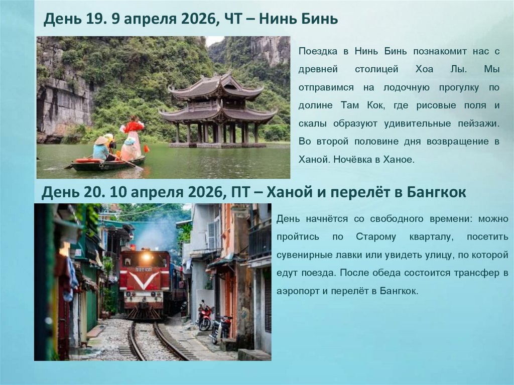 День 19. 9 апреля 2026, ЧТ – Нинь БиньПоездка в Нинь Бинь познакомит нас с