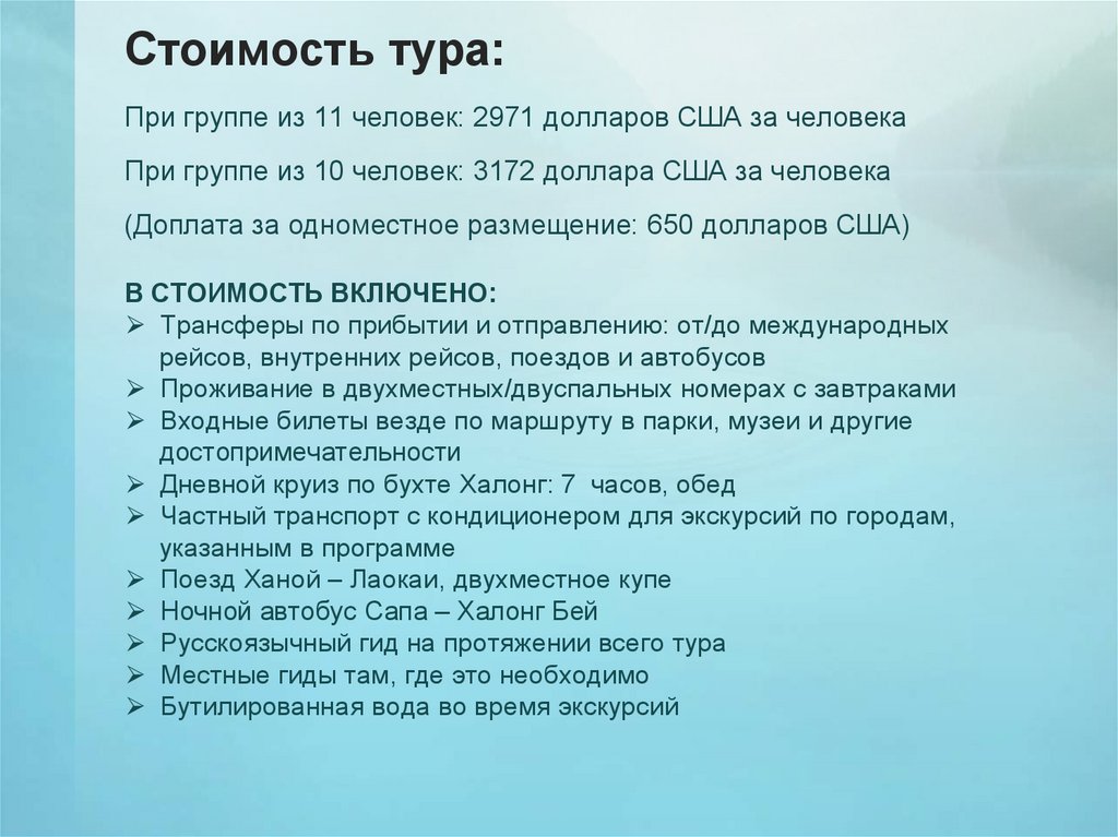 Стоимость тура:При группе из 11 человек: 2971 долларов США за человека