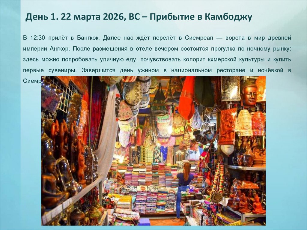 День 1. 22 марта 2026, ВС – Прибытие в КамбоджуВ 12:30 прилёт в Бангкок. Далее нас ждёт перелёт в Сиемреап — ворота в мир древней