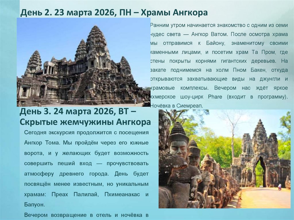День 2. 23 марта 2026, ПН – Храмы АнгкораРанним утром начинается знакомство с одним из семи