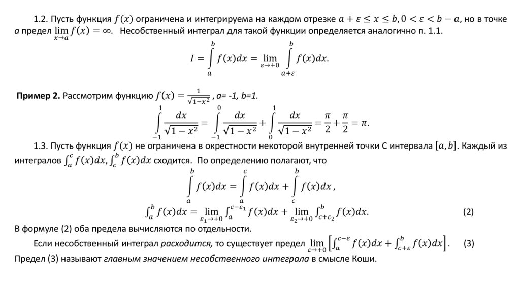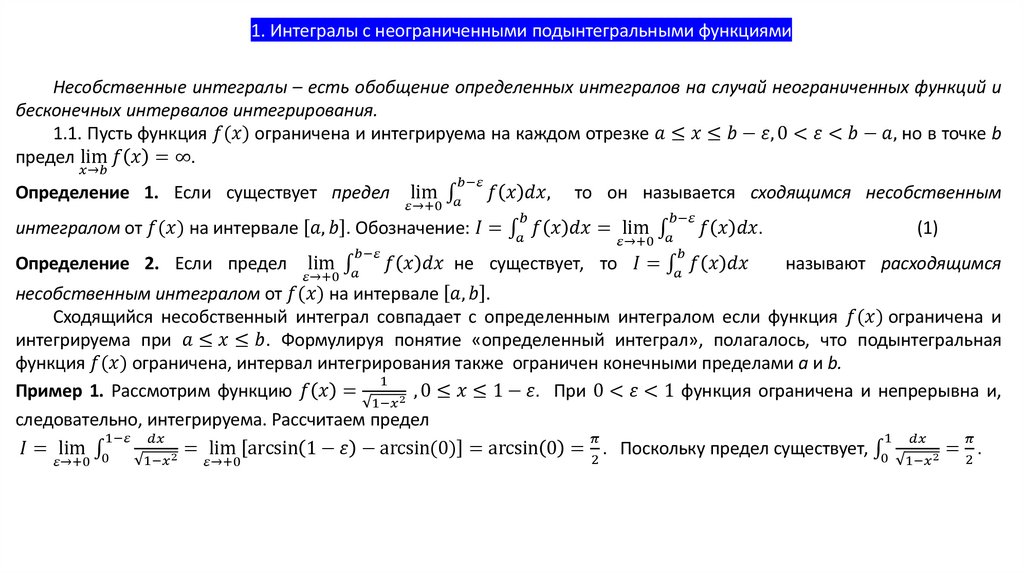 1. Интегралы с неограниченными подынтегральными функциямиНесобственные интегралы – есть обобщение определенных интегралов на случай неограниченных функций и
