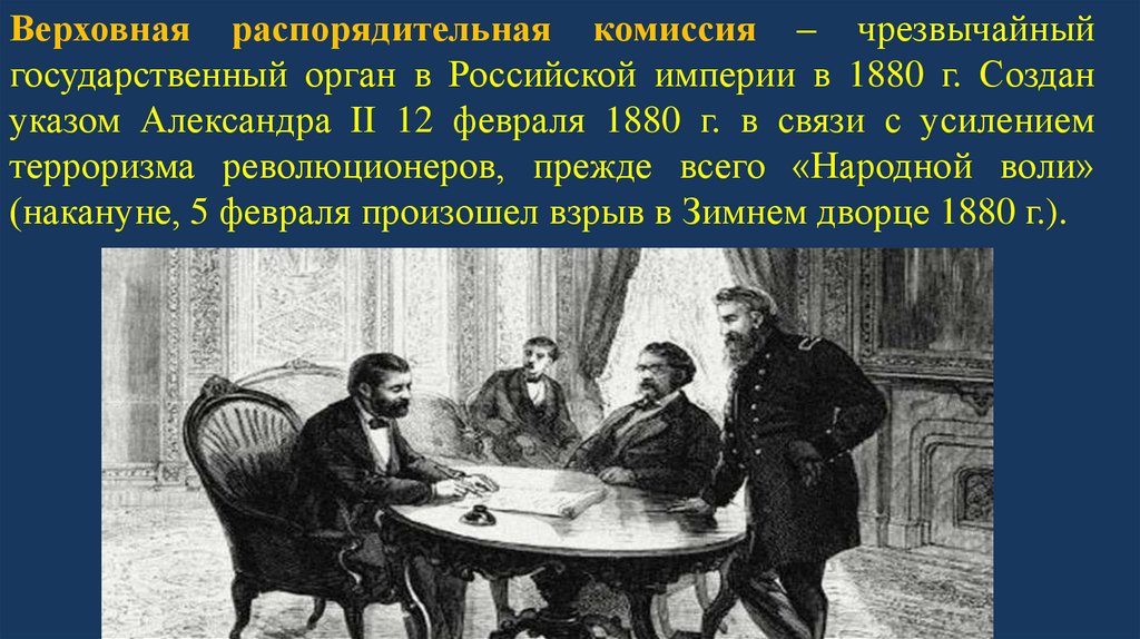 Верховная распорядительная комиссия – чрезвычайныйгосударственный орган в Российской империи в 1880 г. Создан