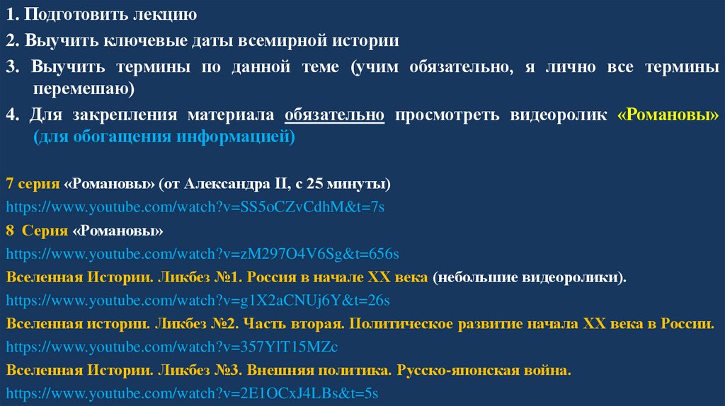 1. Подготовить лекцию2. Выучить ключевые даты всемирной истории
