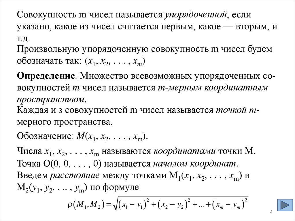 Каждая и з совокупностей m чисел называется точкой mмерного пространства.