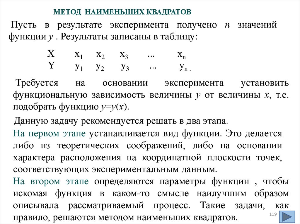 МЕТОД НАИМЕНЬШИХ КВАДРАТОВПусть в результате эксперимента получено n значений