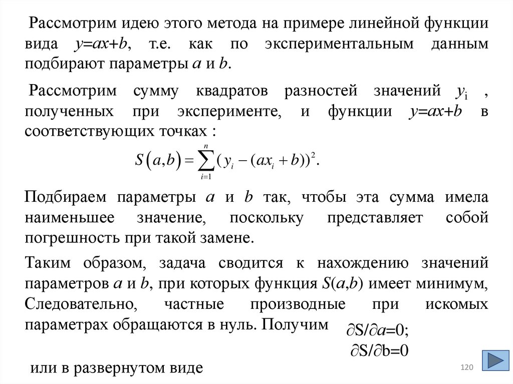 Рассмотрим идею этого метода на примере линейной функциивида у=ах+b, т.е. как по экспериментальным данным