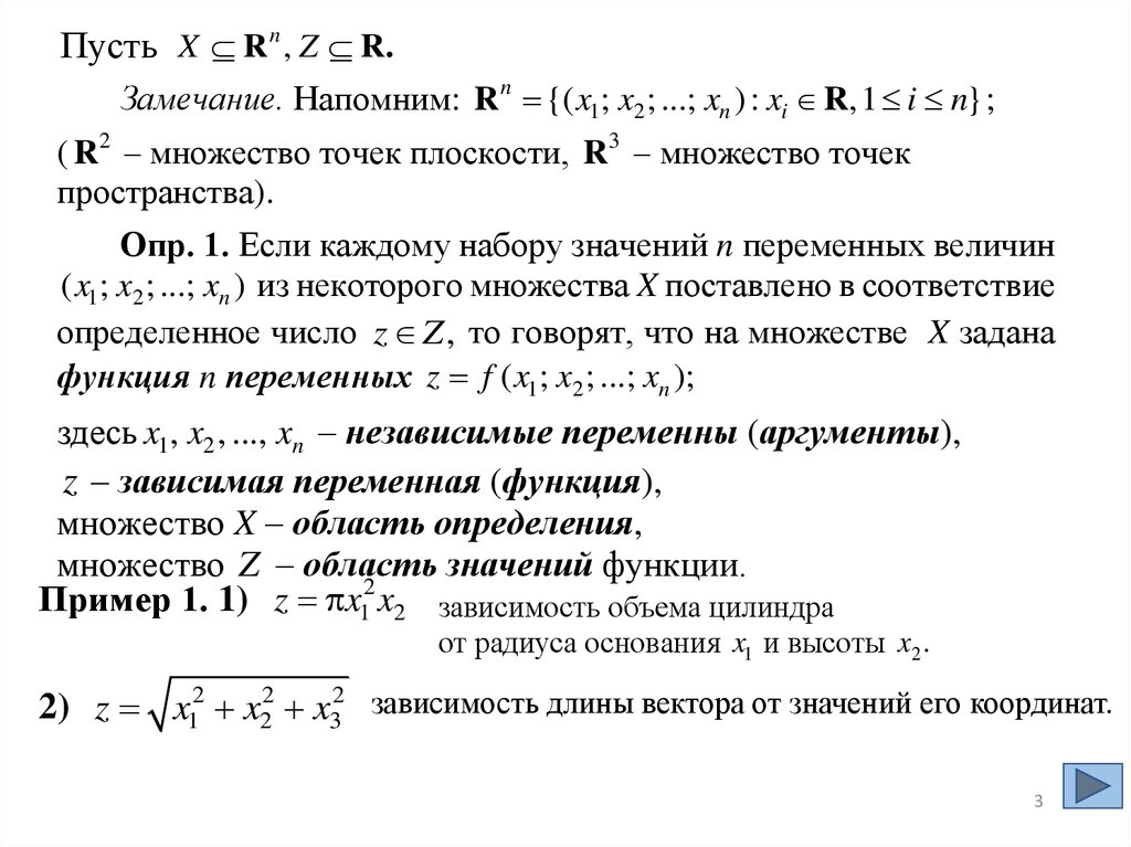 Пусть X R n , Z R..Замечание. Напомним: R n {( x1; x2 ; ...; xn ) : xi R,1 i n} ;