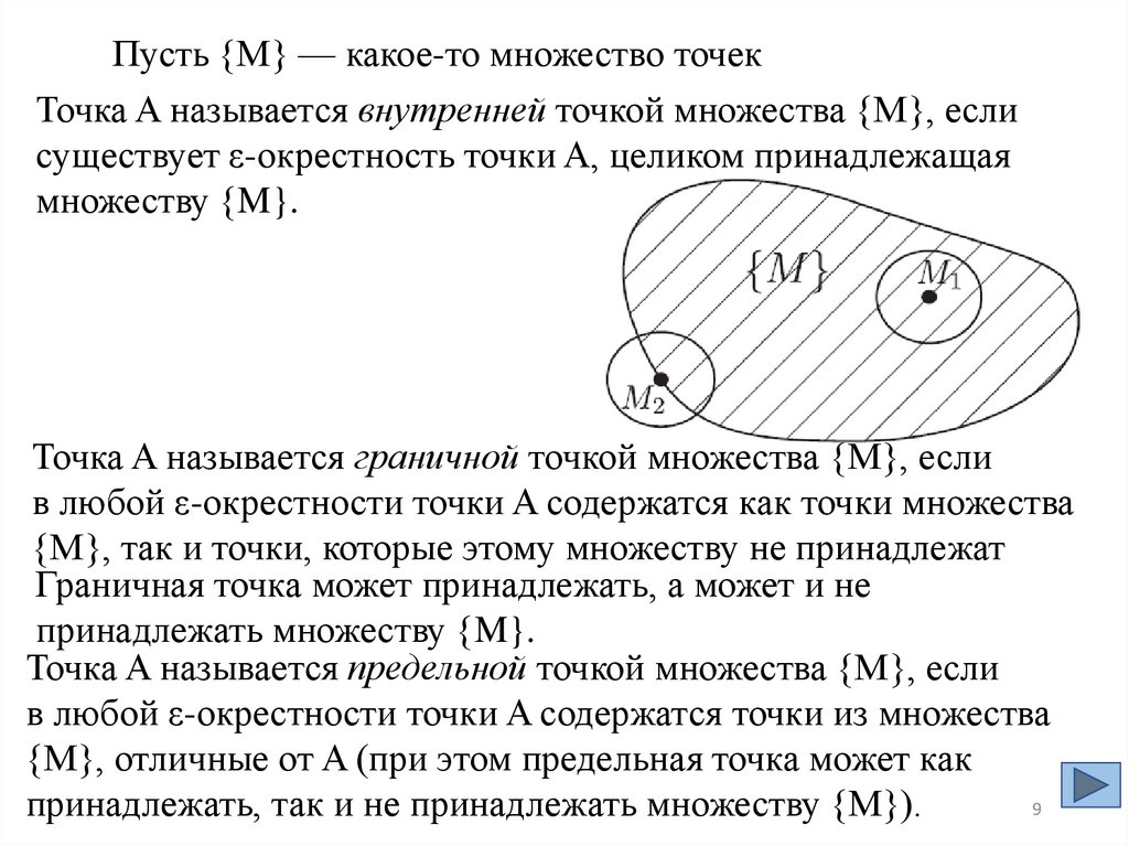 Пусть {M} — какое-то множество точекТочка A называется внутренней точкой множества {M}, если