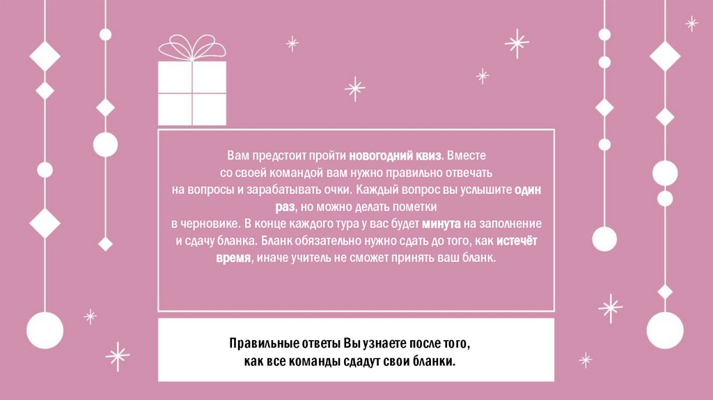 Вам предстоит пройти новогодний квиз. Вместесо своей командой вам нужно правильно отвечать