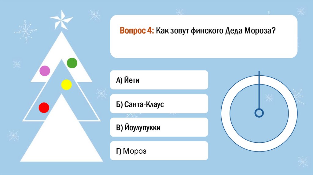 Вопрос 4: Как зовут финского Деда Мороза?А) Йети