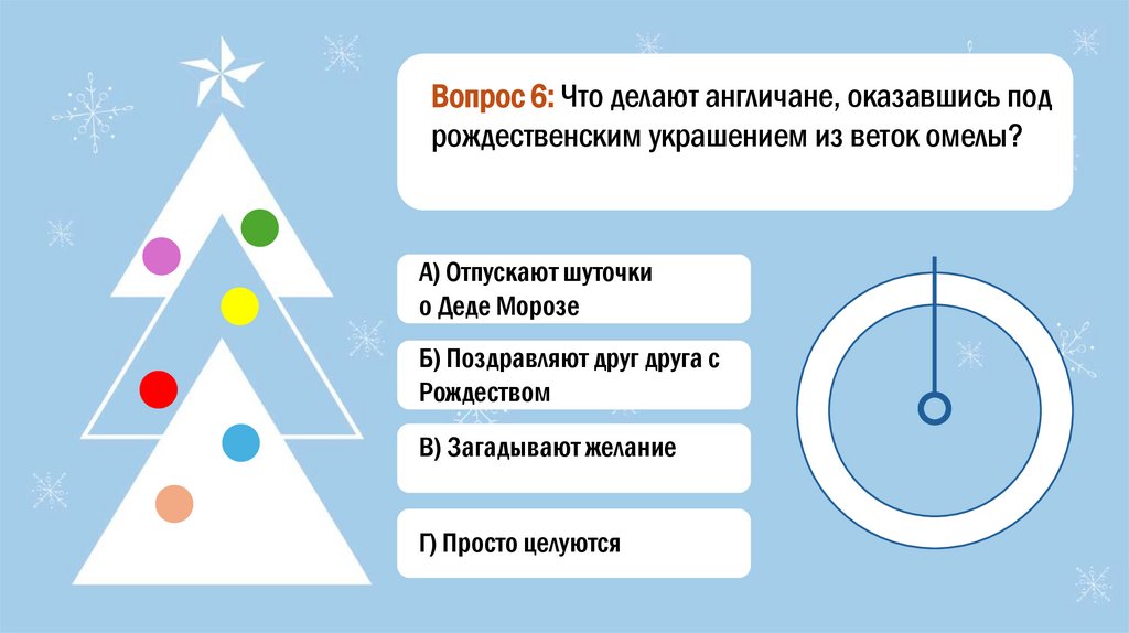 Вопрос 6: Что делают англичане, оказавшись подрождественским украшением из веток омелы?