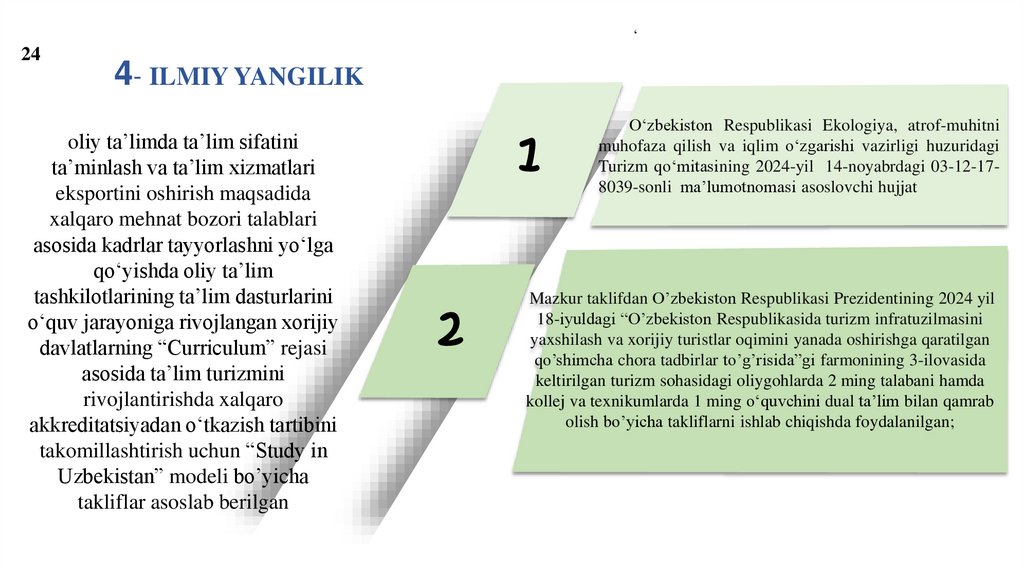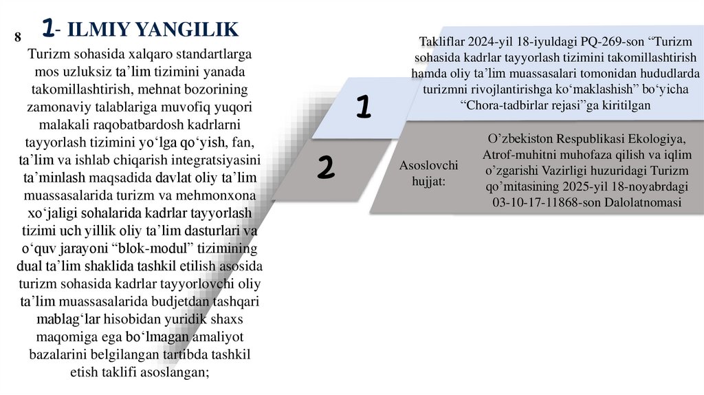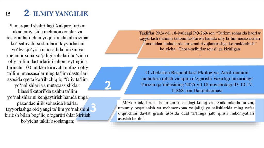 tashkil qilish chora tadbirlari to‘g‘risida”gi, 2024-yil 18-iyuldagi PQ-269-son “Turizm sohasida