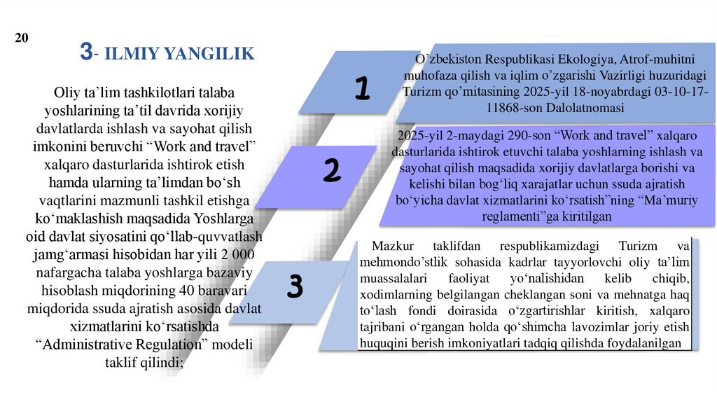 beruvchi “Work and travel” xalqaro dasturlarida ishtirok etish hamda ularning taʼlimdan boʻsh vaqtlarini mazmunli