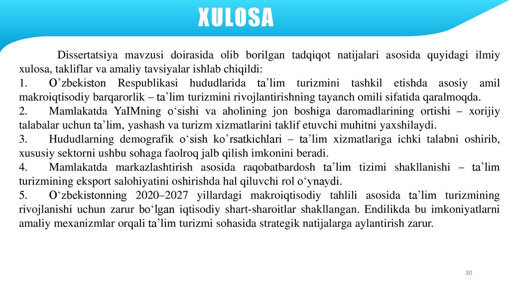 XULOSADissertatsiya mavzusi doirasida olib borilgan tadqiqot natijalari asosida quyidagi ilmiy