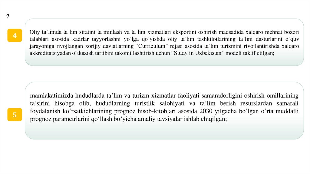 • Chet ellik talabalar uchun o‘zbek tili va madaniyati dasturlarining kengayishi,