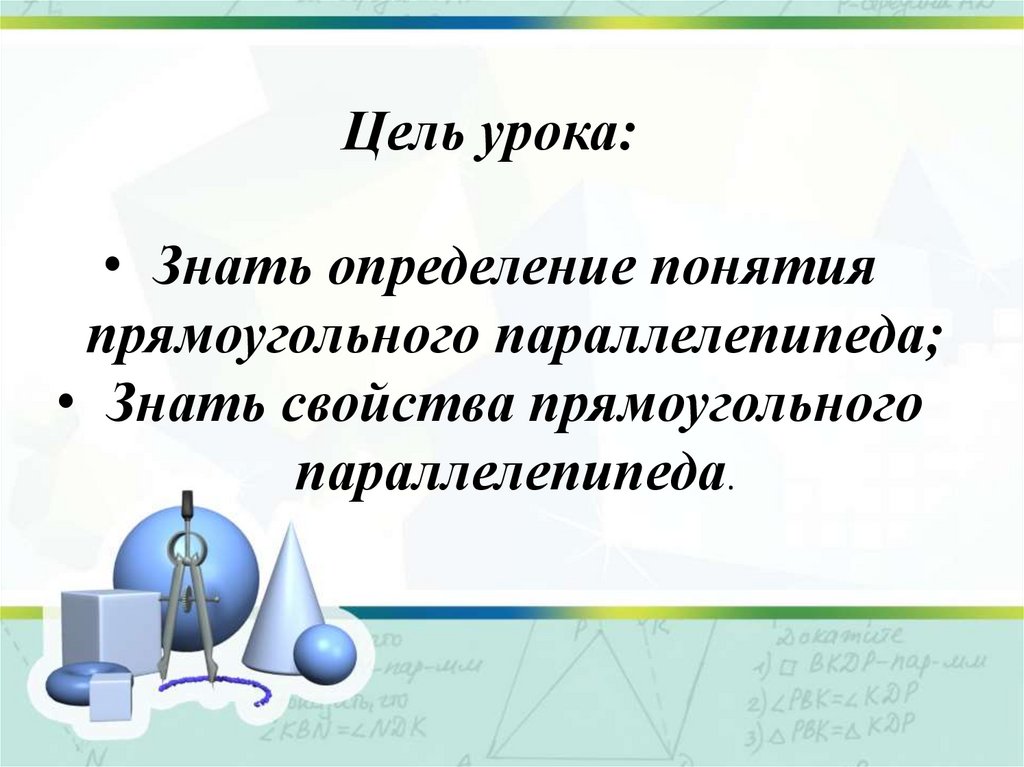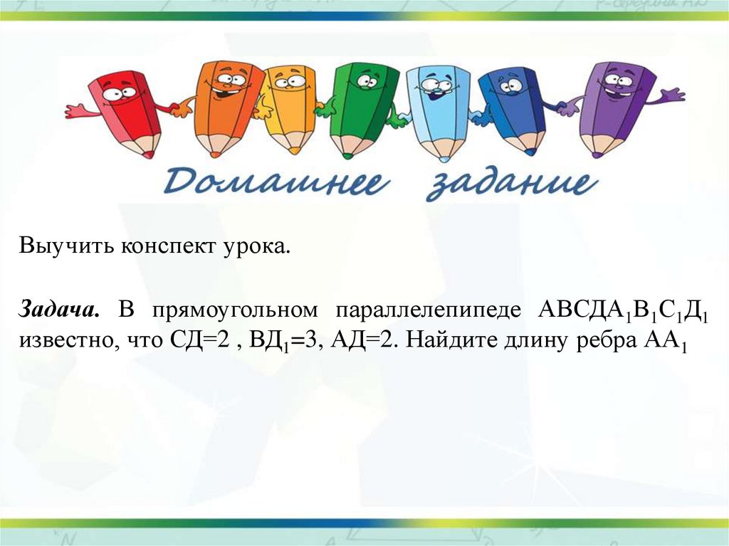 Выучить конспект урока.Задача. В прямоугольном параллелепипеде АВСДА1В1С1Д1