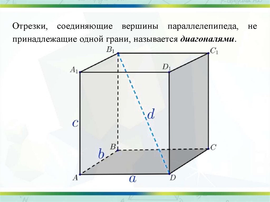 Отрезки, соединяющие вершины параллелепипеда, непринадлежащие одной грани, называется диагоналями.