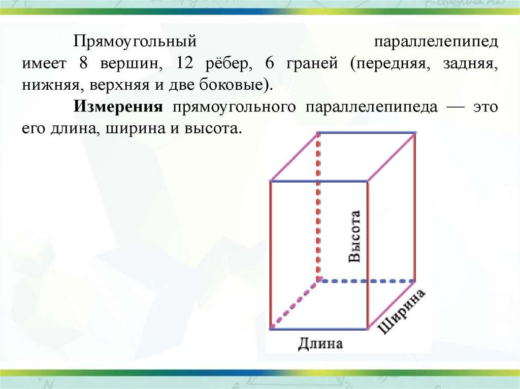 имеет 8 вершин, 12 рёбер, 6 граней (передняя, задняя,