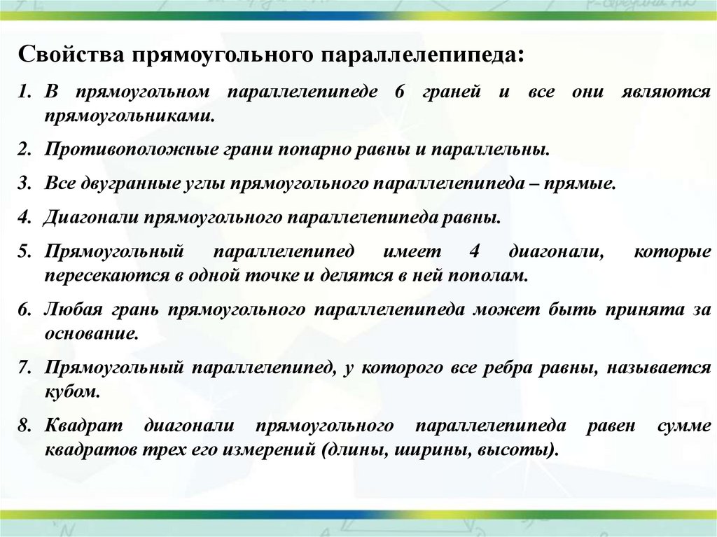 Свойства прямоугольного параллелепипеда:1. В прямоугольном параллелепипеде 6 граней и все они являются