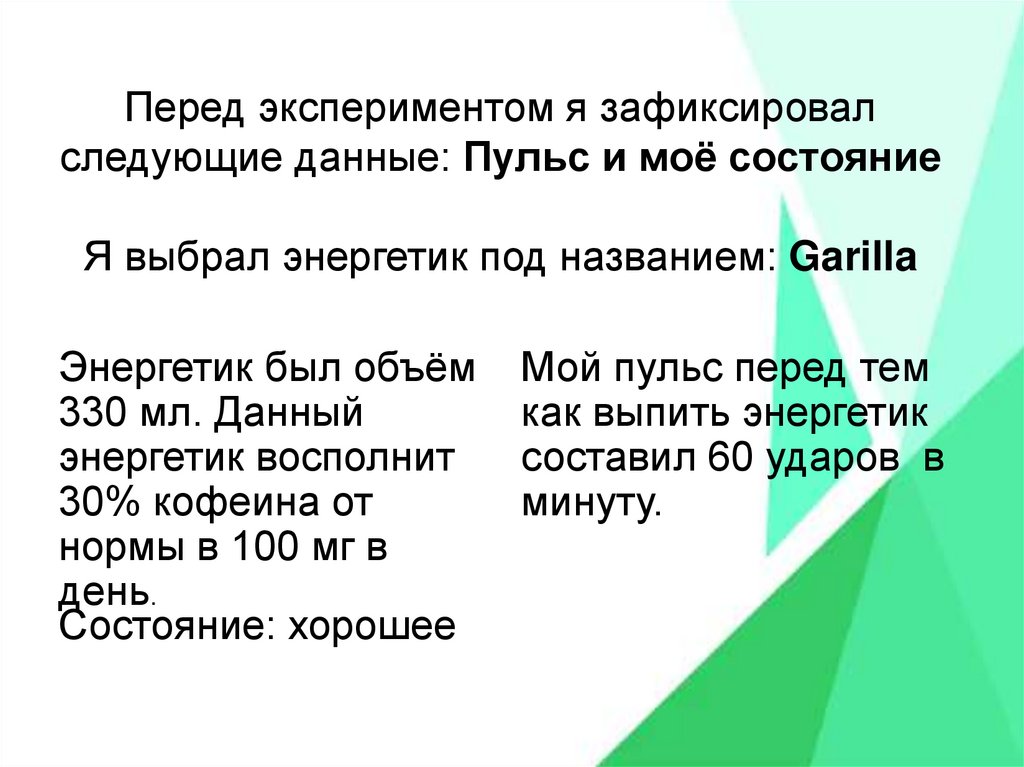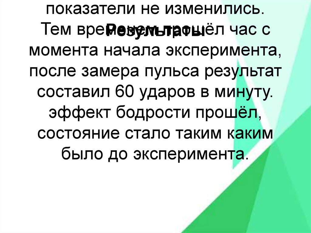 Перед экспериментом я зафиксировалследующие данные: Пульс и моё состояние