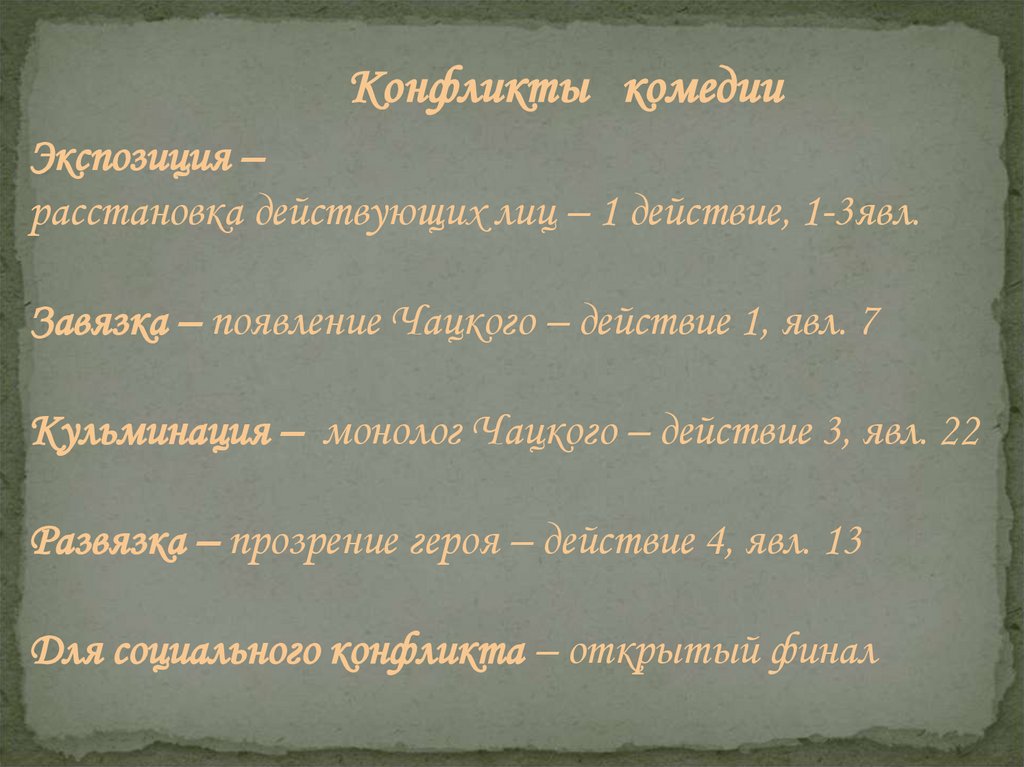 Кульминация – монолог Чацкого – действие 3, явл. 22