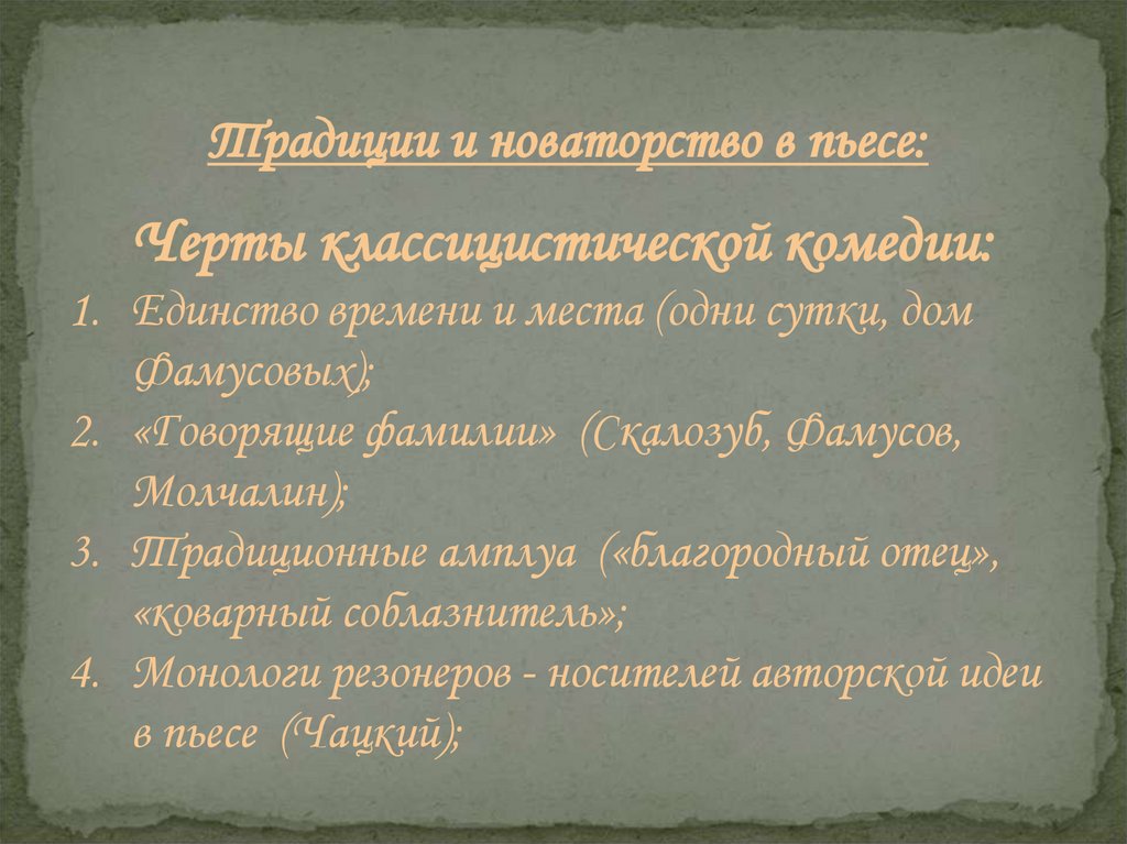 Традиции и новаторство в пьесе:Черты классицистической комедии: