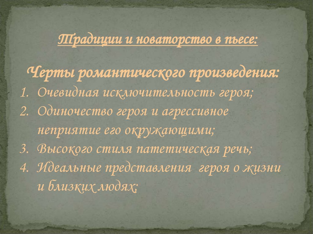 Традиции и новаторство в пьесе:Черты романтического произведения: