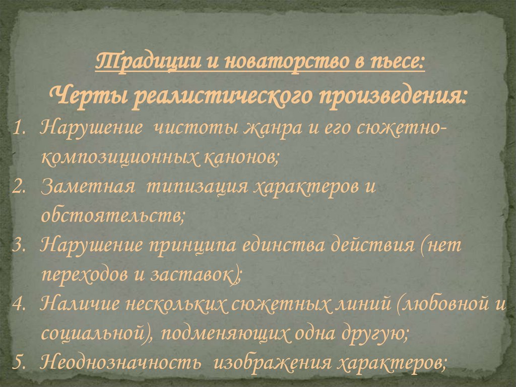 Традиции и новаторство в пьесе:Черты реалистического произведения: